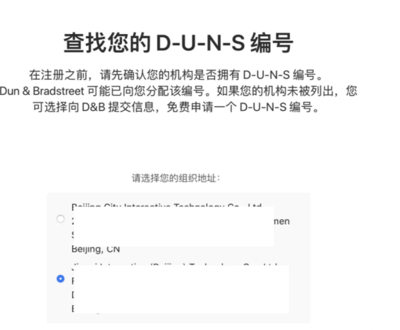 此处会根据您上一步填写的公司名称和地址,找到附近已经申请过邓白氏码的公司,查看一下有没有您公司,若有,选中,点击继续,会查看到之前申请的邓白氏码,若没有,则返回上一页